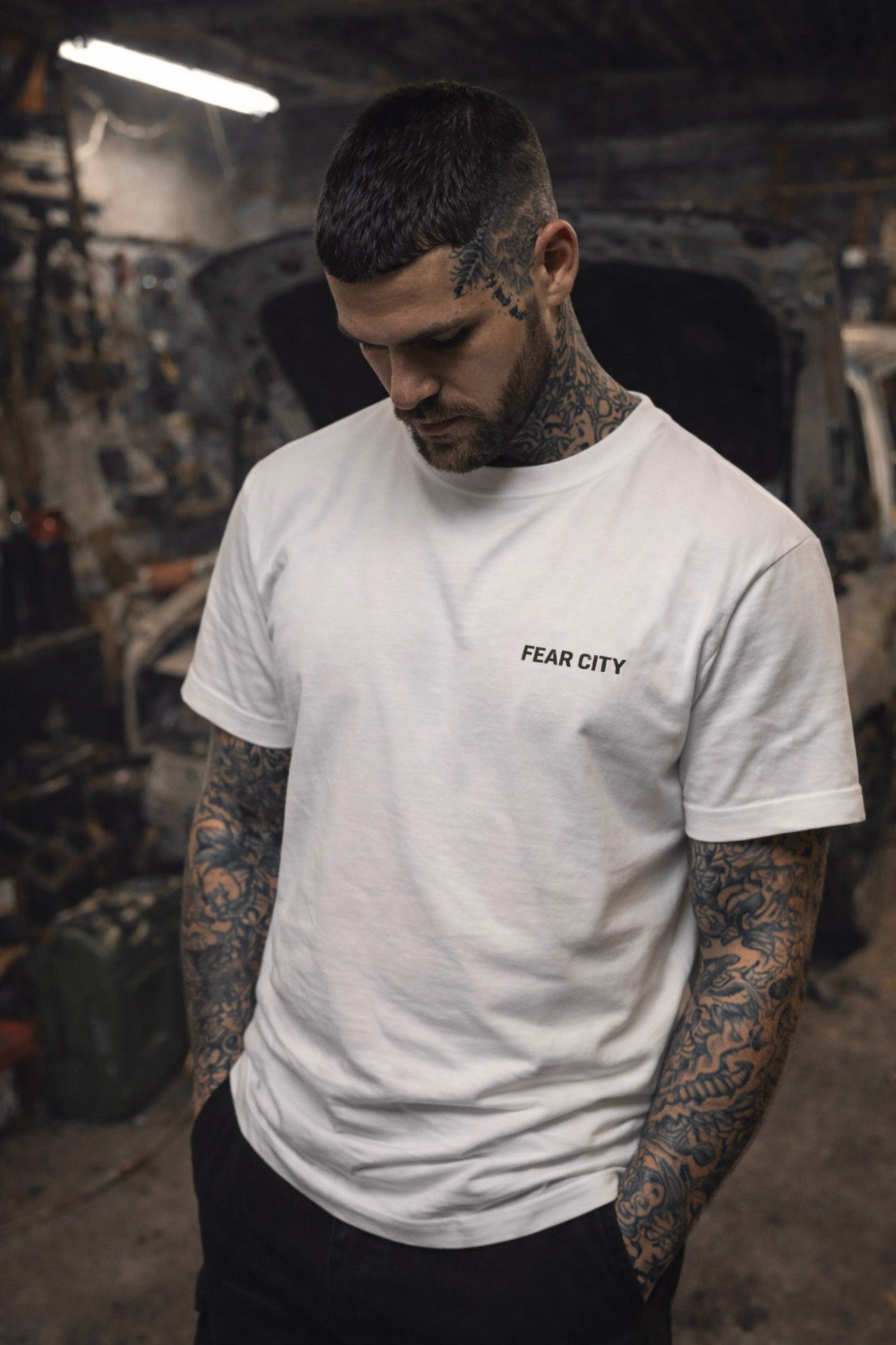 FEAR CITY RAW T-SHIRT – WHITE / FRONT & BACKPRINT